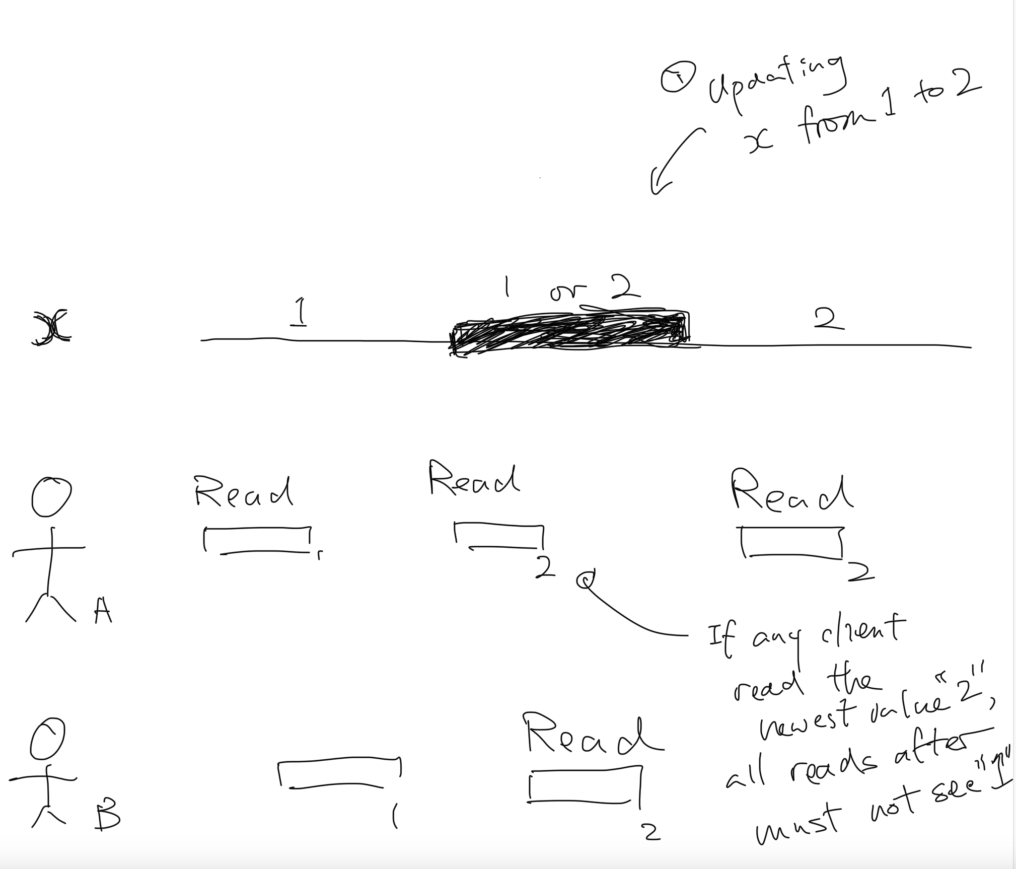 - Whenever any client reads the most recent value of the data, any subsequent read by other clients must not return an older copy of data.